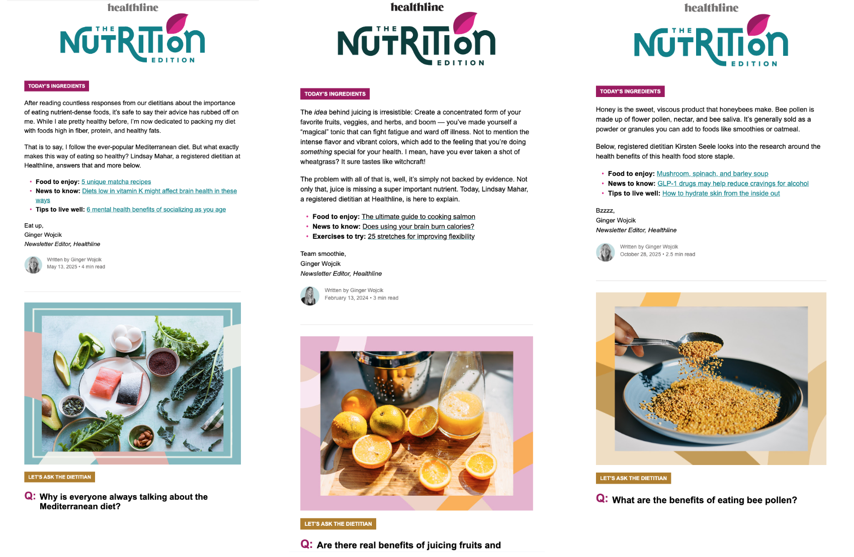 Curated photo research and visual assets for The Nutrition Edition, Healthline’s thrice-weekly newsletter covering food, wellness, and nutrition insights. Responsibilities included curating, editing, and compositing imagery to align with brand style and boost reader engagement across digital platforms.